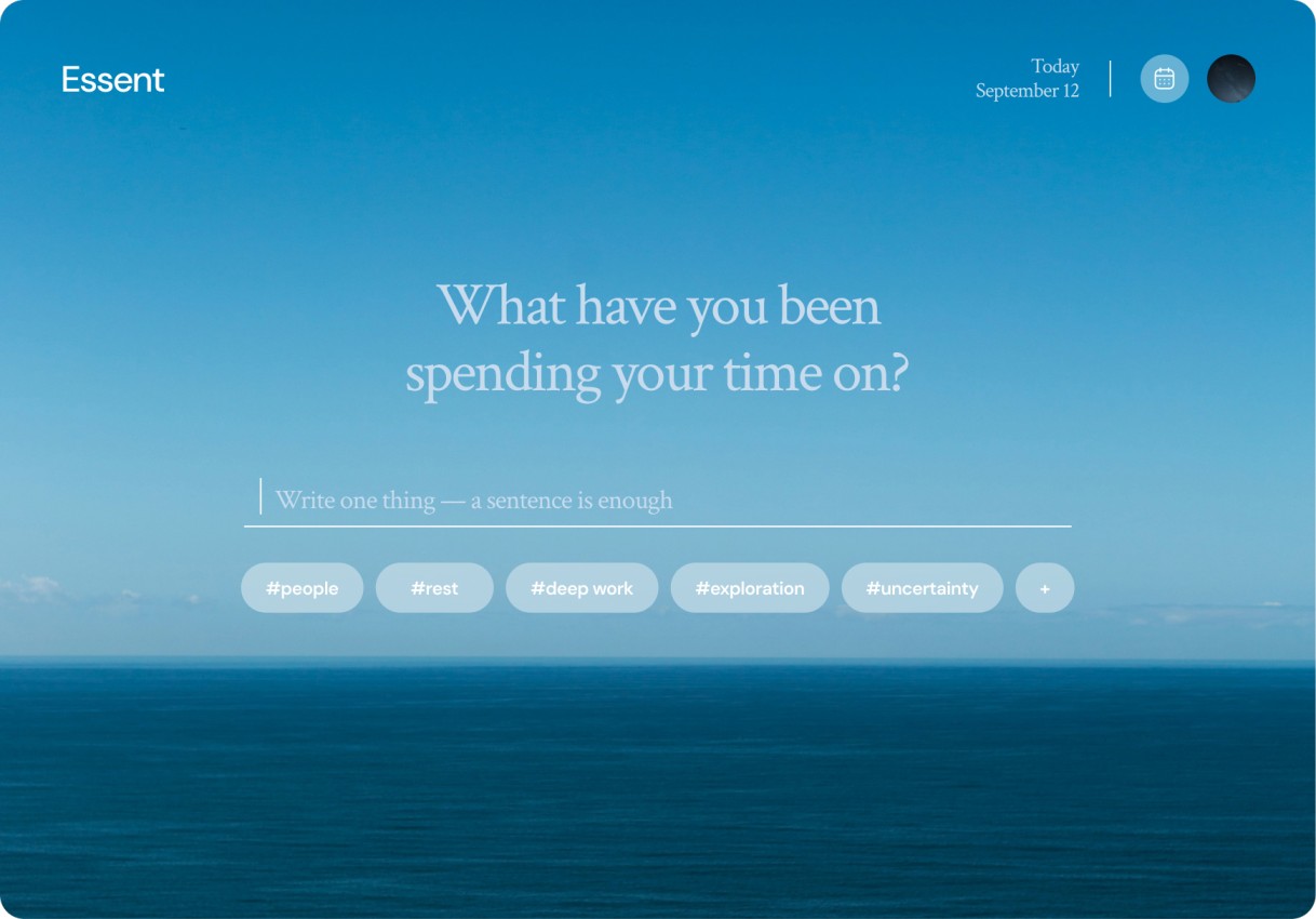 Essent is a quiet system that helps you understand how you spend your time — so you can see the rhythm of your life, and make it easier for the right people to be part of it.