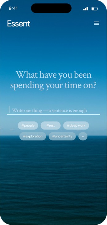 Essent helps you notice how your time is spent, make sense of what keeps showing up, and turn that clarity into something you can share — only when you choose. Nothing is public by default. Nothing is forced.